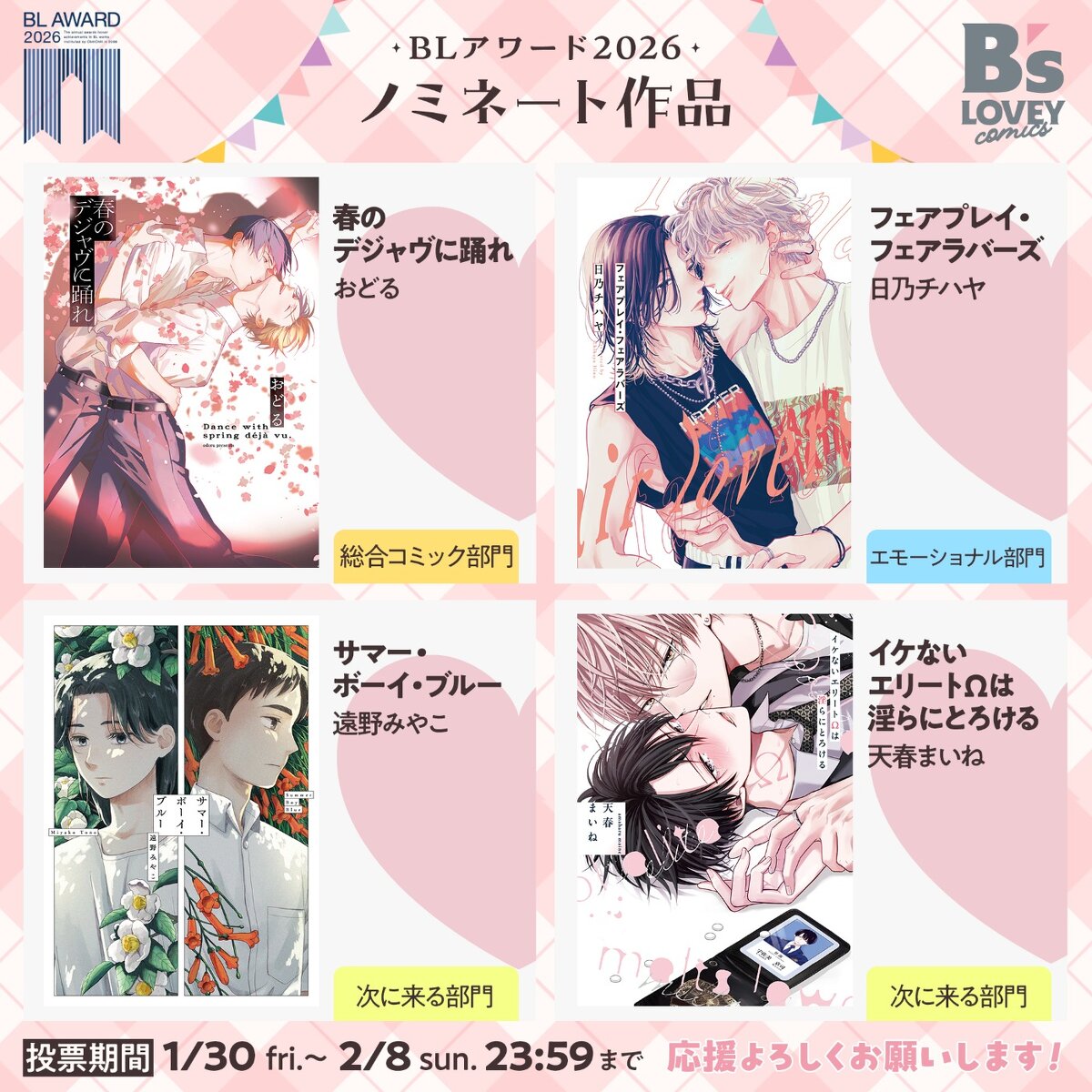 毎月無料連載公開中! 攻めと受けの属性でカップリング検索 CP属性検索 [攻め]選択 男前 年下 高校生 執着 大学生 リーマン ワンコ 年上 俺様 ノンケ 同級生 黒髪 幼馴染 後輩 アルファ 教師 スーツ バイト 先輩 隣人 恋人 Sub Dom [受け]選択 健気 高校生 黒髪 年上 美形 リーマン メガネ ゲイ ツンデレ ノンケ 強気 年下 大学生 同級生 ほだされ 教師 先輩 幼馴染 天然 オメガ Dom Sub 連載情報 コミックス ニュース 連載情報information 今月の更新 もっと見る pixivコミック連載information もっと見る 02月発売 02月14日発売 俺たちはバグってる イササカ 購入する 紙書籍 電子書籍 試し読み 02月14日発売 真夏のスロウエンド あたさわ 購入する 紙書籍 電子書籍 試し読み 02月14日発売 月にいのりを、愛のねがいを rimei 購入する 紙書籍 電子書籍 試し読み 02月14日発売 おっさんだけど聖女です 2 八凰 藍子桃瀬 わさびにやま 購入する 紙書籍 電子書籍 試し読み 02月14日発売 悪役へび男は英雄狼に食べられる 1 榎宮 束冬之 ゆたんぽ 購入する 紙書籍 電子書籍 試し読み 01月発売 01月15日発売 転生しても嫌われ王子だったので関係修復頑張ります。 4 時任 遊也 購入する 紙書籍 電子書籍 試し読み 01月15日発売 破壊しちゃうらびゅ! 日ノ下 いきる 購入する 紙書籍 電子書籍 試し読み もっと見る ニュース&特典情報 2026年1月30日(金) 編集部より BLアワード2026へ4作品がノミネート! 2026年1月30日(金) 編集部より 「サマー・ボーイ・ブルー」番外編 『花緑青』電子ストアで販売決定! 2026年1月30日(金) 編集部より 特製ポスター掲出中! 2026年1月16日(金) フェア情報 「春のデジャヴに踊れ」マンガチャにラインナップ! 2026年1月16日(金) 編集部より 「春のデジャヴに踊れ」続編制作決定!…なのにもうすぐ1話が読める!? 2026年1月7日(水) 特典情報 1月15日発売!『転生しても嫌われ王子だったので関係修復頑張ります。』4特典情報 もっと見る 単話配信information もっと見る 今週のアクセスランキングRanking 公式エックスX Tweets by BSLOVEY B’s LOVEY COMICS Tweets by BL_andGENTE &GENTE &GENTE 最新動画&GENTE ーアンジェンテー 公式YOUTUBE 「声でたのしむ、好きが見つかる!」BLボイスコミック もっと見る &GENTE TikTok&GENTE ーアンジェンテー 公式TikTok &GENTE